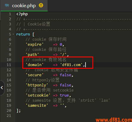修改配置文件:/config/cookie.php里的cookie 有效域名'domain' => 'df81.com',为您的域名即可,如下图所示: